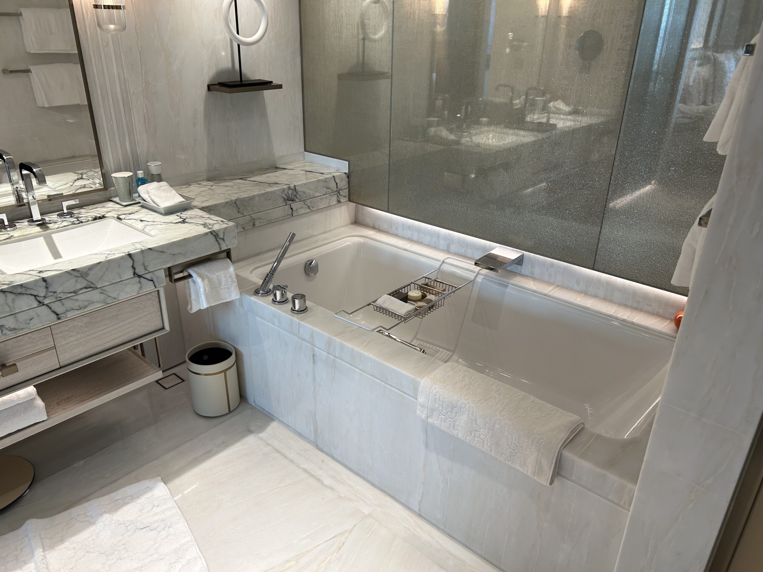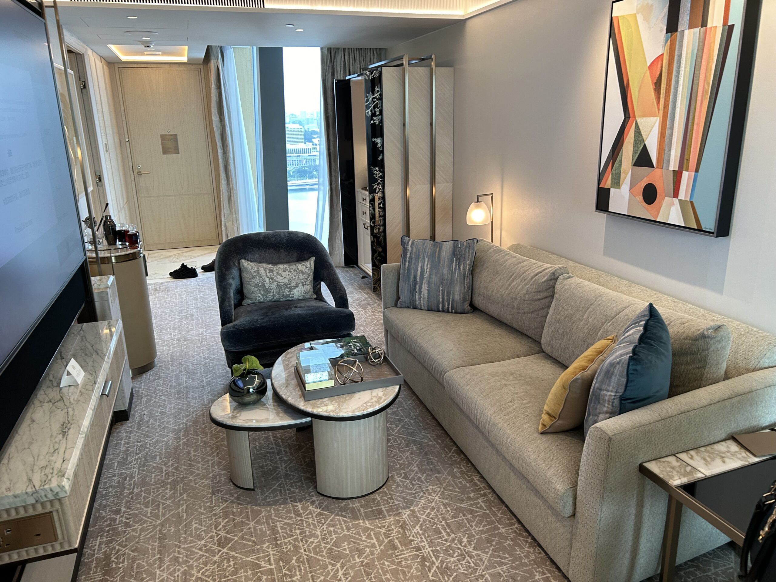 ロビーに入った瞬間から天井の高さにびっくり。スイート宿泊者は専用カウンターでチェックインできて、待ち時間も少なめでした。